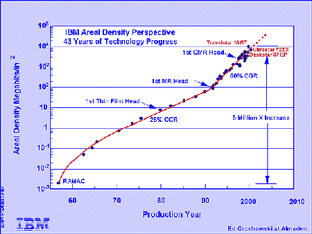 הצפיפות על גבי פלטות הדיסק ממשיכה לגדול בקצב מדהים, ועוברת כבר רבות מהנבואות האופטימיות ביותר מלפני מספר שנים. להלן עקומה של IBM המתארת את התקדמות הצפיפות האזורית